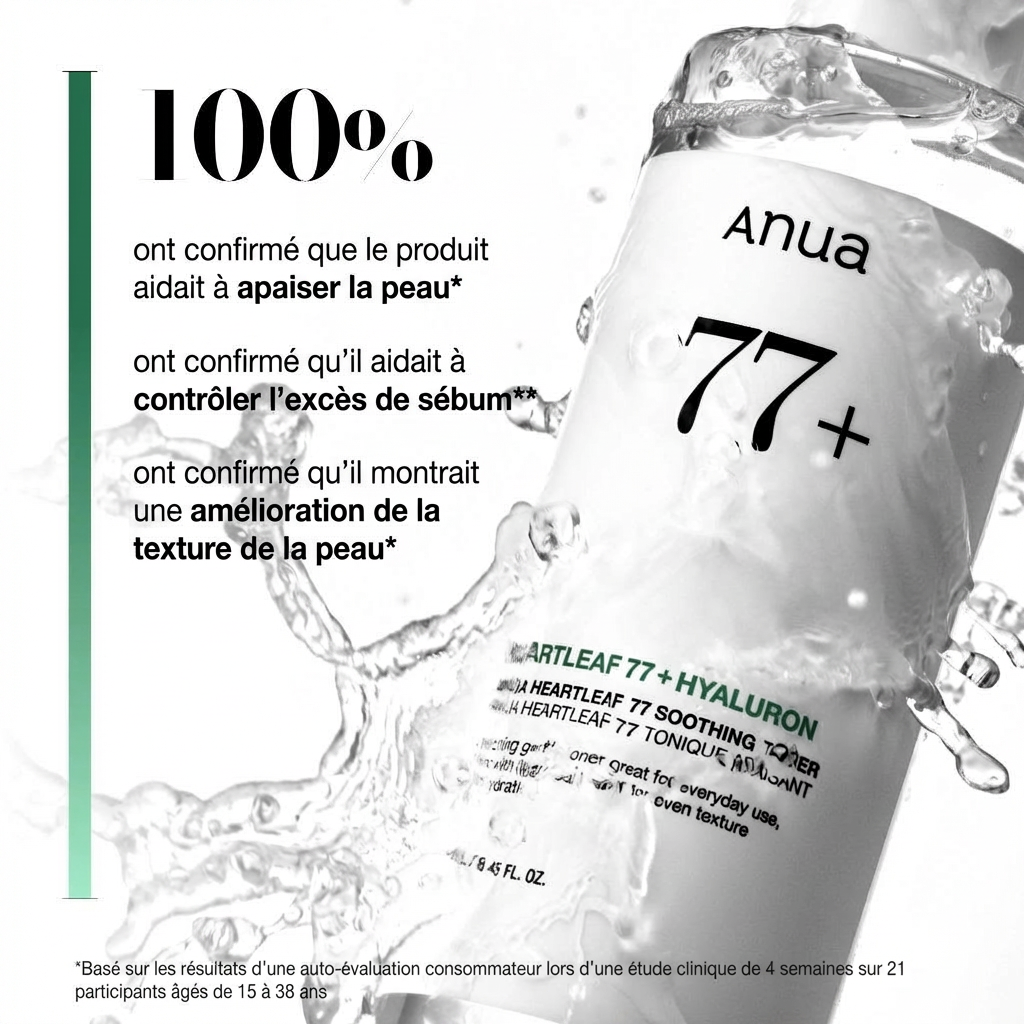 - 77% d’Extrait de Houttuynia Cordata (Heartleaf) : Pour dégonfler les imperfections.