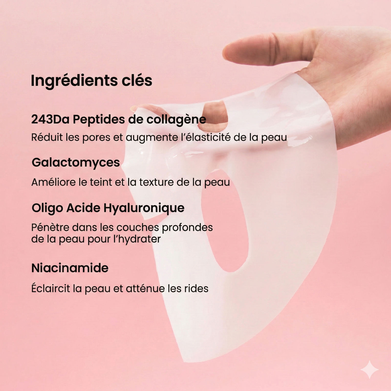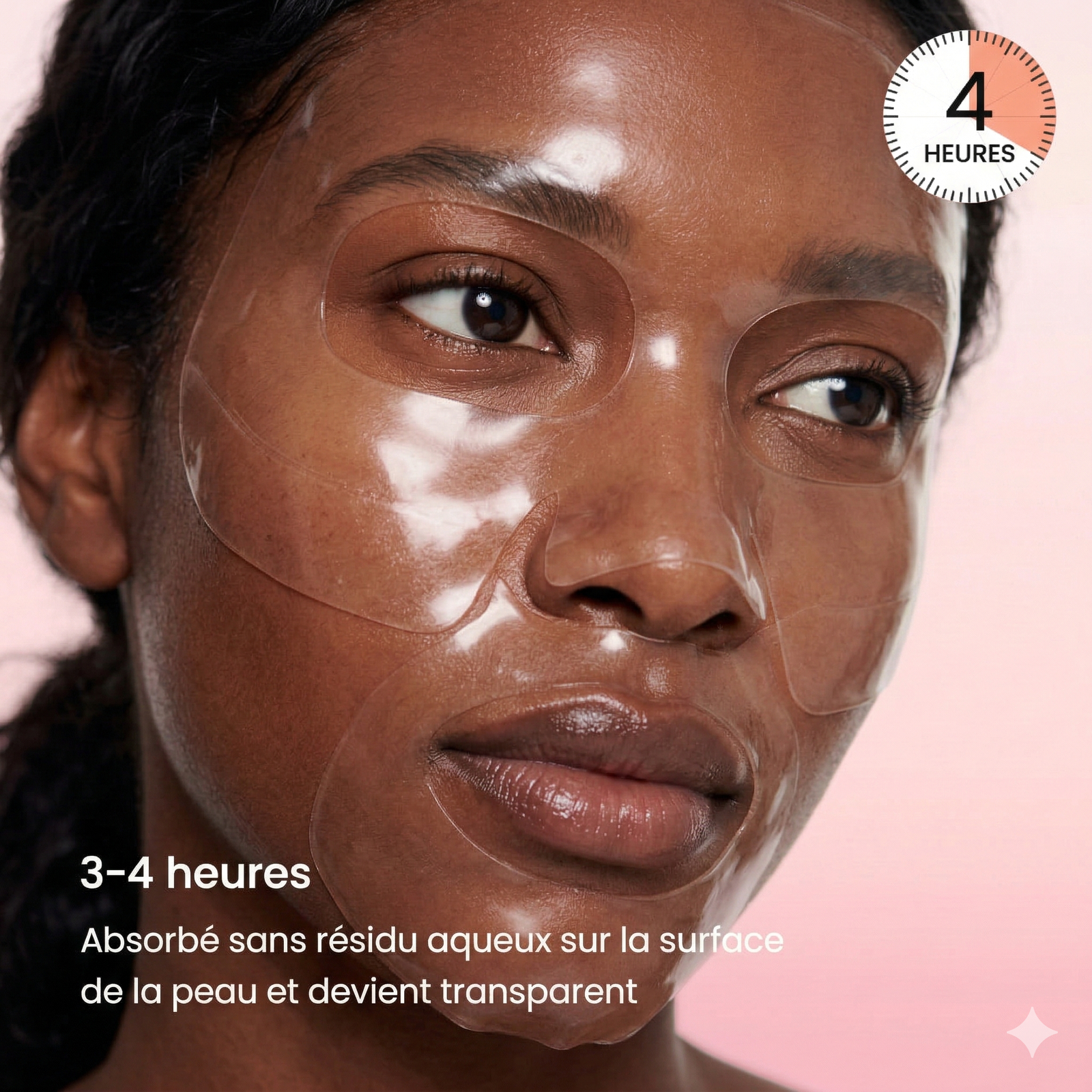• Absorption Visuelle Révolutionnaire : Un masque hydrogel blanc qui devient transparent au bout de 3 à 4 heures, prouvant que les actifs ont été totalement absorbés par votre peau.