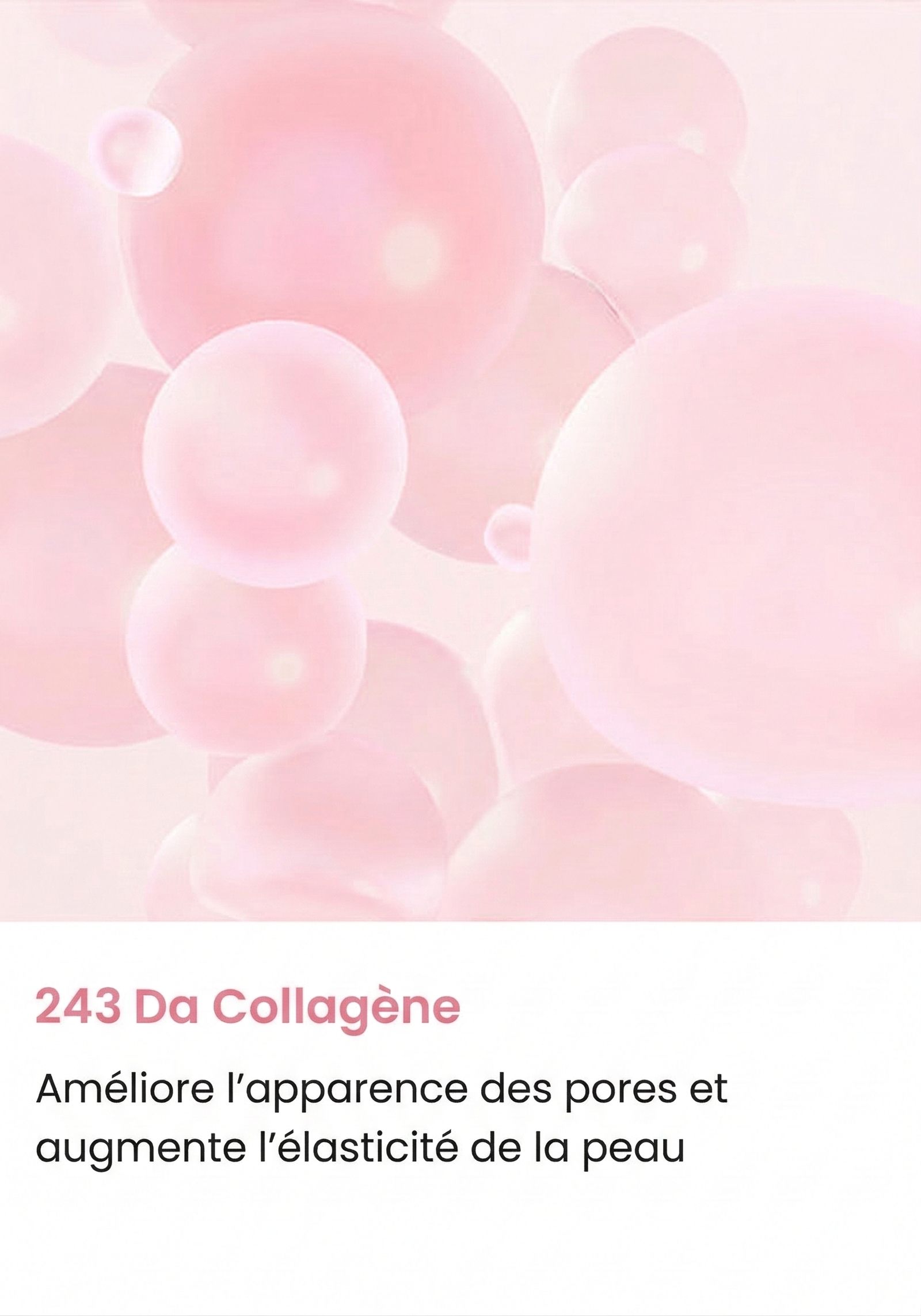 • Collagène Ultra-Pénétrant : Utilise du collagène de très petite taille (243 Da) pour passer à travers les pores et raffermir la peau de l’intérieur.